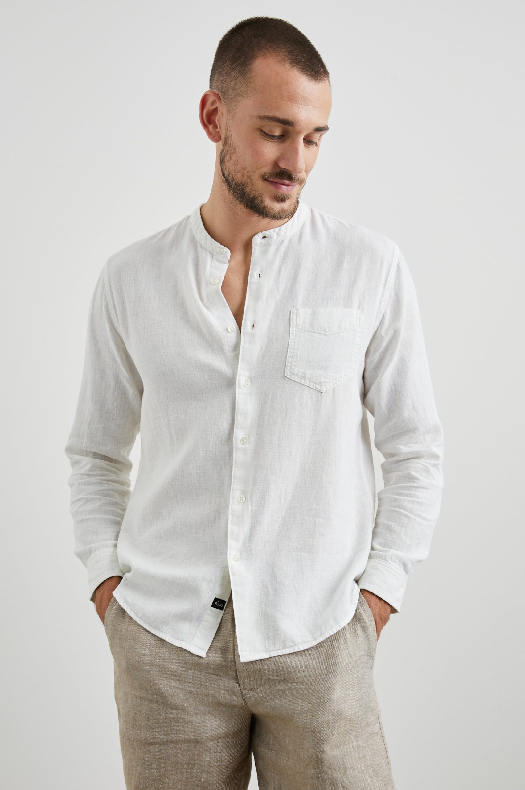 Inspired by French workwear, this collarless shirt is perfect for elevating your button-down collection. The Antoine is crafted from a linen-cotton blend that makes it a warm weather necessity.