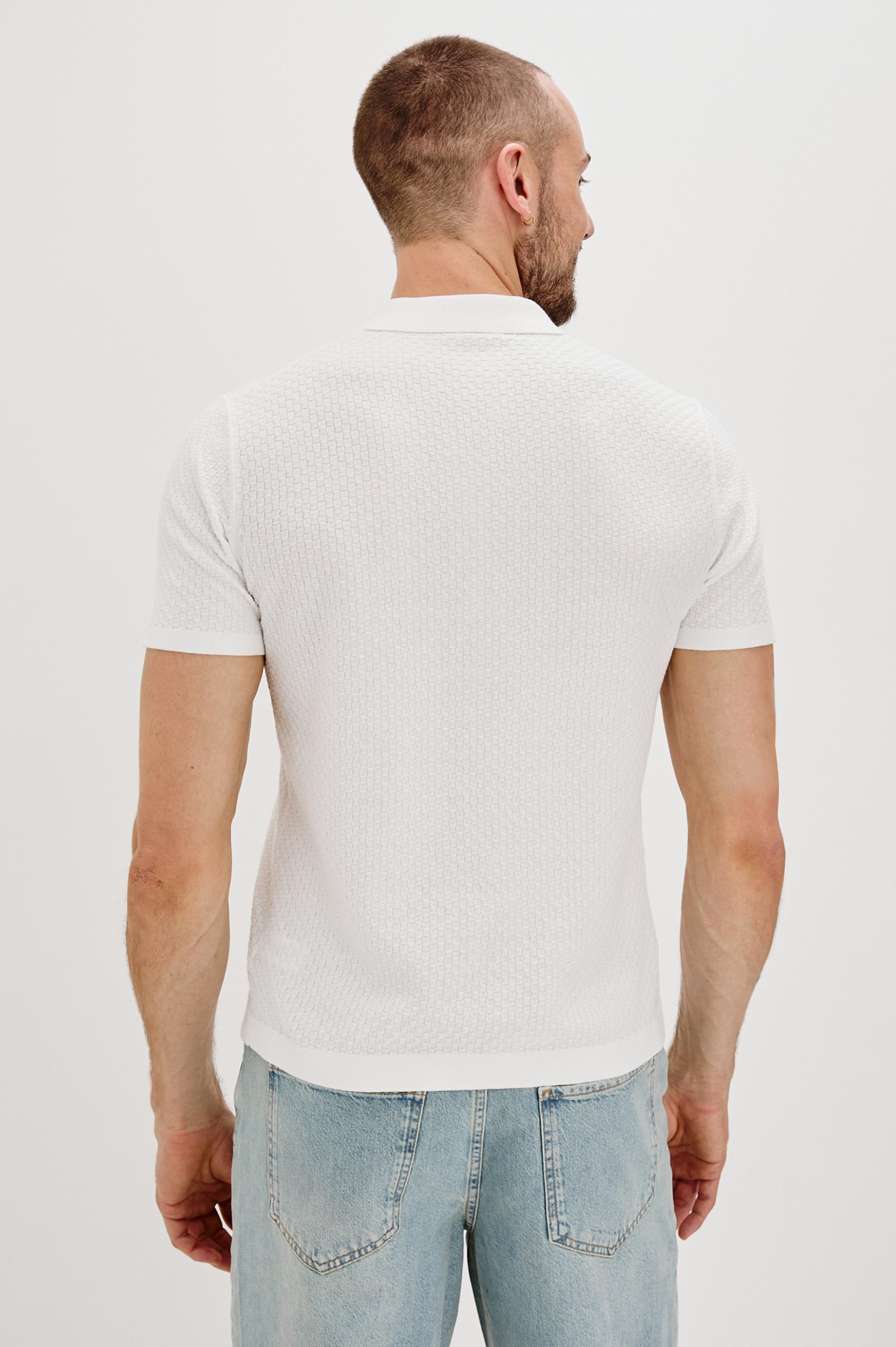 The Emilio offers a refined twist on the classic short-sleeve knit. Crafted from lightweight cotton yarn fabric with basket stitch detailing, it delivers a luxe feel, while contrast buttons add a distinctive touch.