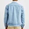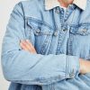 Long sleeve, rugged denim canvas exterior in a light blue, cream collared jacket featuring faux sherpa lining, chest patch pockets with button closures, button-down front closure, and classic fit. This plush, vintage inspired jacket is the perfect layering piece for cooler transitional weather.