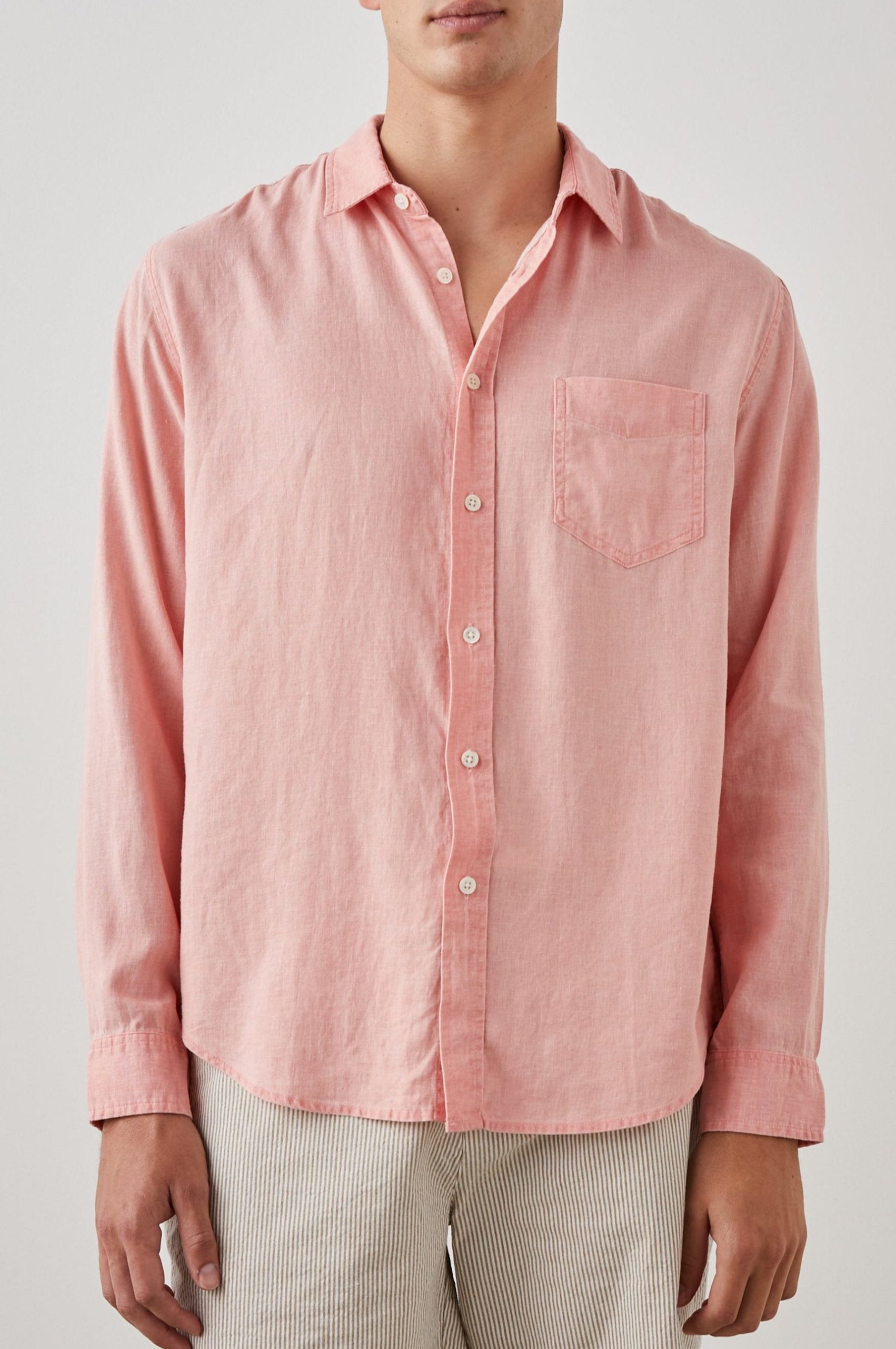 The Mykonos Shirt will take you from day to night with its breathable linen fabrication. The staple shirt features a relaxed collar, long sleeves, and a single patch pocket at chest.