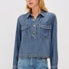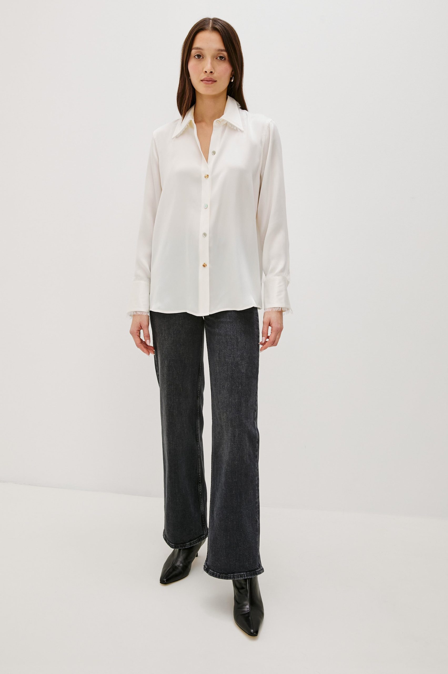 The Abbey is a silk charmeuse button-down with raw edge detailing at the collar and cuffs. It offers an easy fit with a touch of feminine flair.