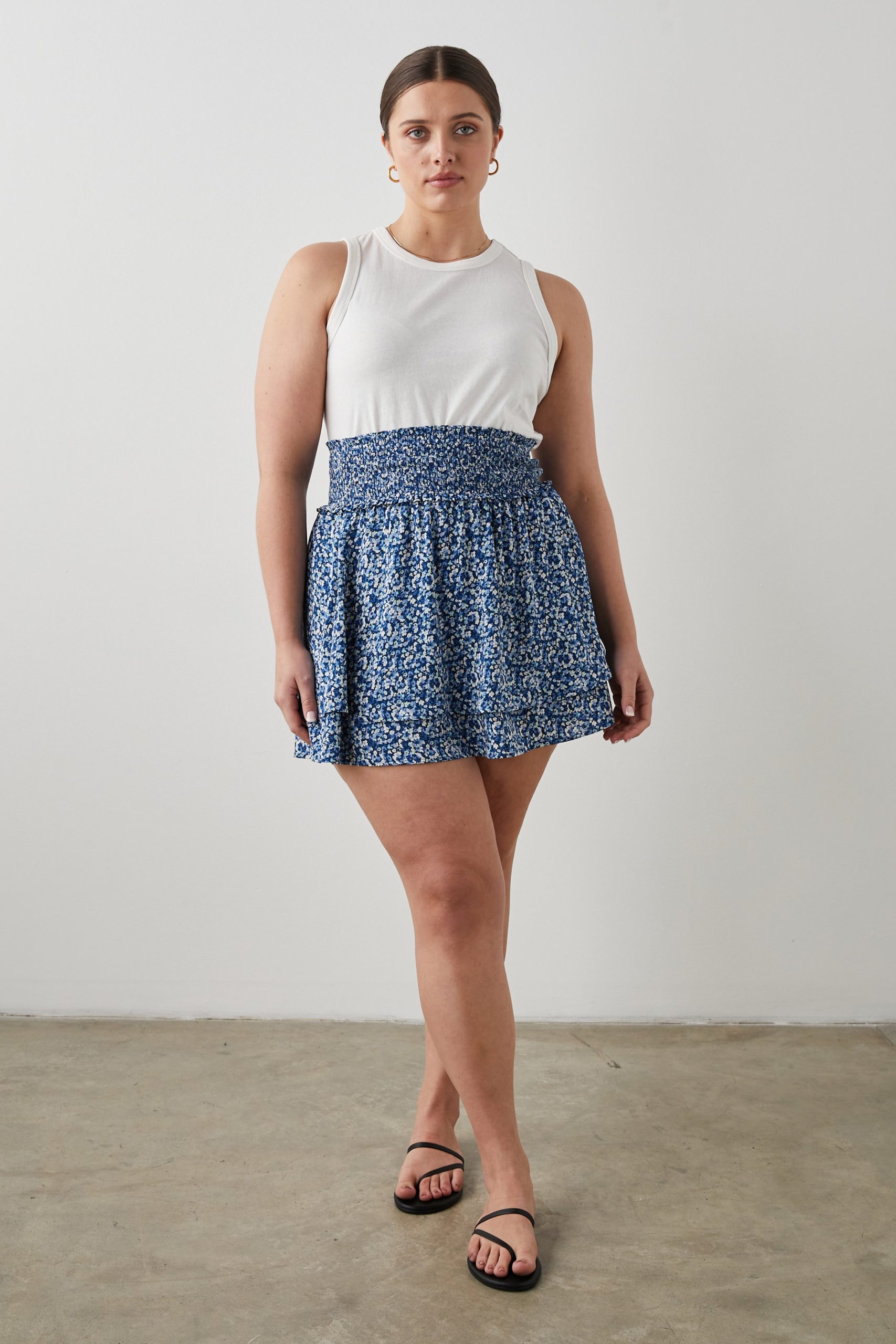 The Addison Skirt catches the eye with a mini length, flattering fit, and subtle romantic detailing. The feminine style has a pull-on, elastic waist and flowy, rayon-crepe fabric that effortlessly sways with every step. The blue floral print adds interest to any outfit.