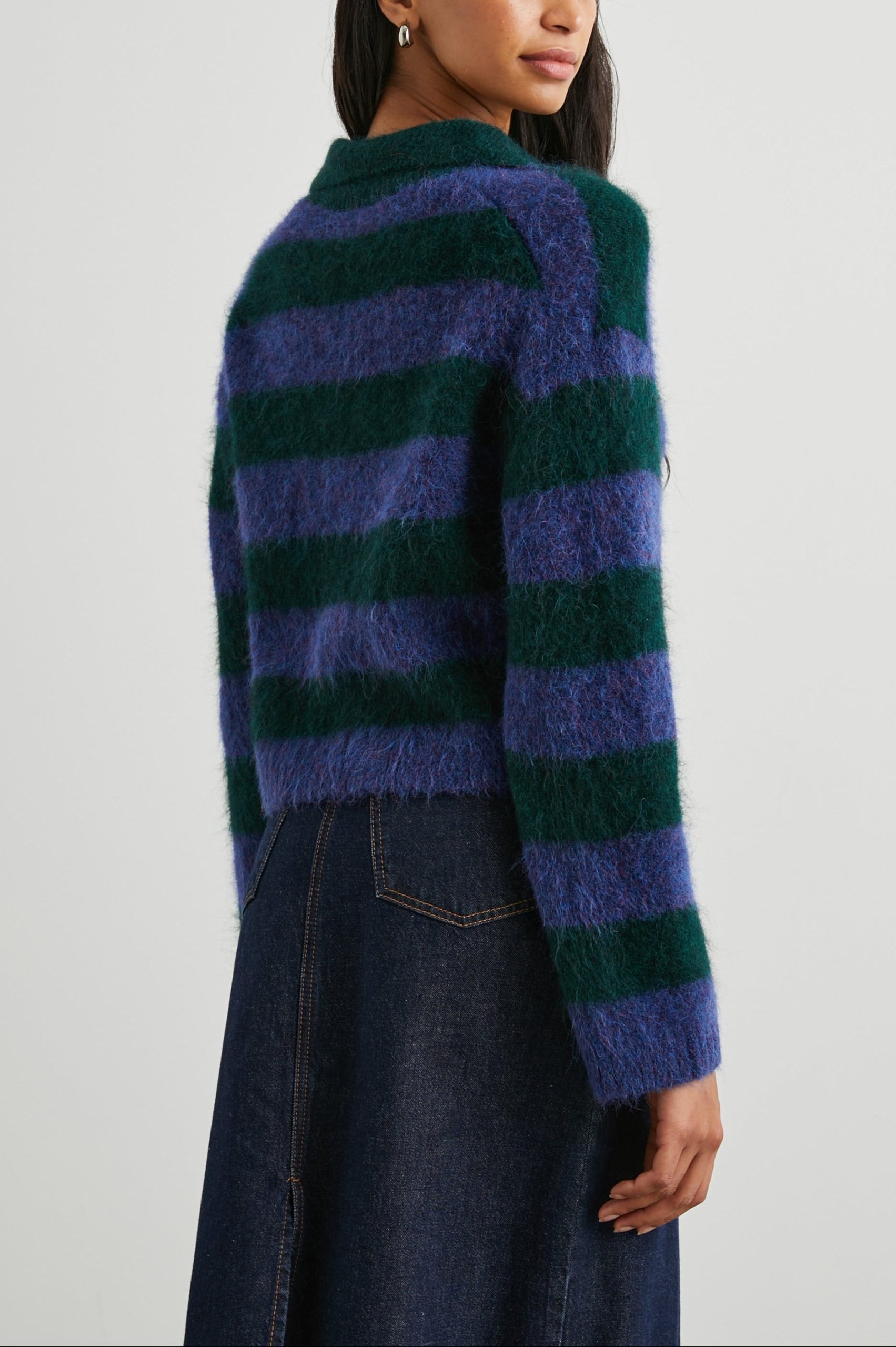Make an entrance in this bold, yet classic sweater, crafted from a soft and warm alpaca blend. With a full button placket, collar, and unique purple and forest green stripes, this style is sure to be on repeat in your collection.