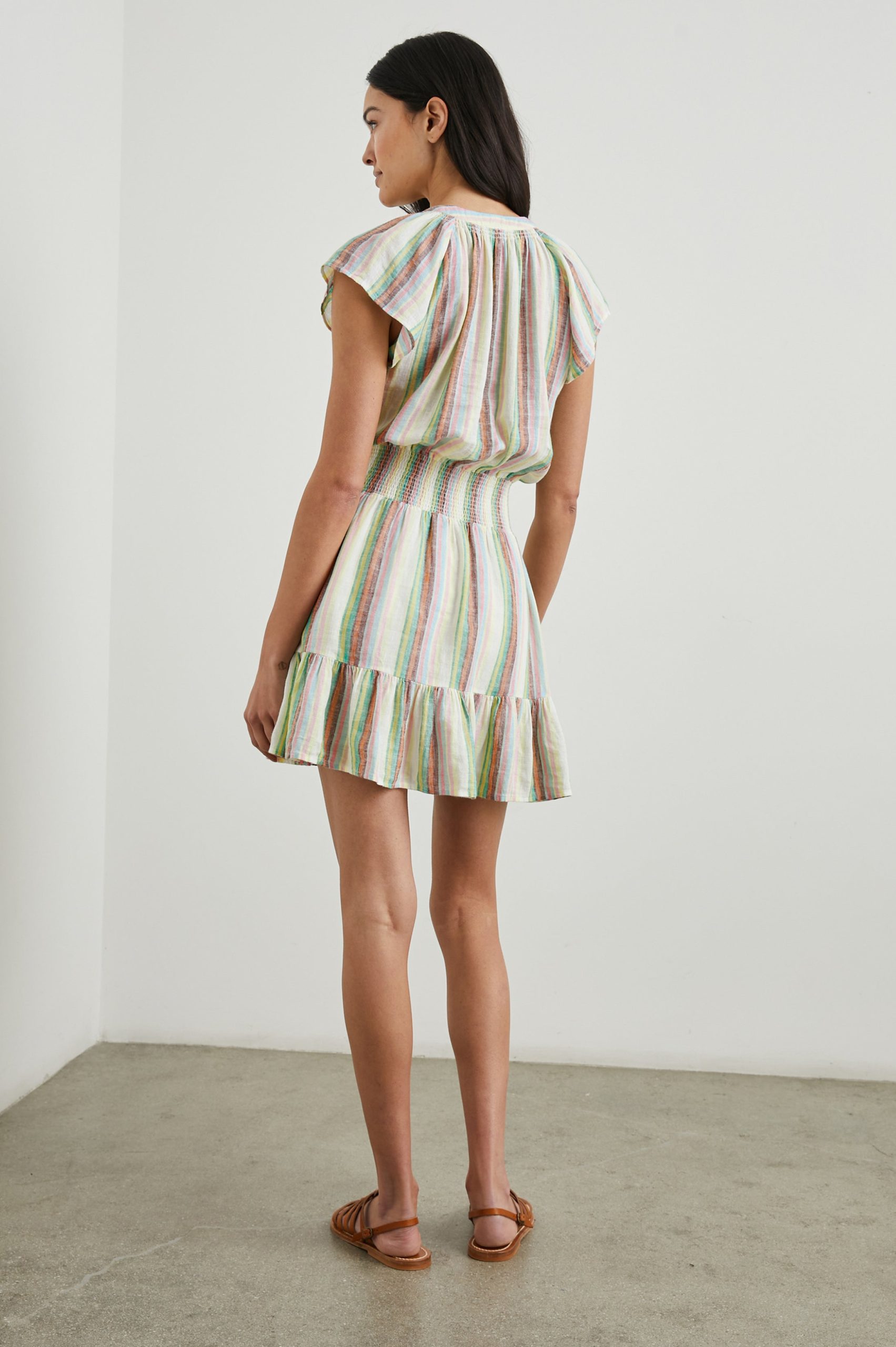 Smocked with flutter cap sleeves and a flowy-tiered skirt, the Augustine is crafted from luxe linen for all-day comfort. Yarn-dyed in Cambria stripe with shell buttons and a half-henley neckline, this is the perfect addition to your wardrobe.