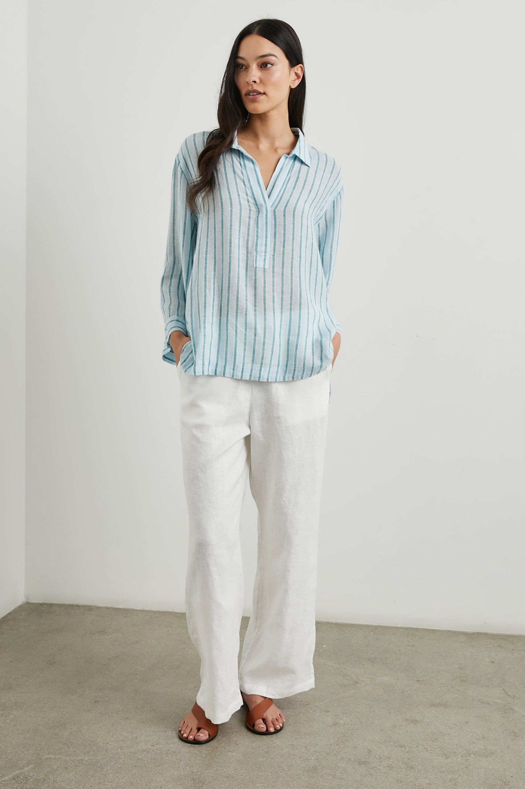 Yarn-dyed in Cambria stripe with a half-henley neckline, the Banks is a luxe linen shirt that goes from swimsuit cover-up to everyday wear.