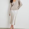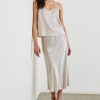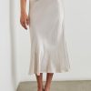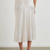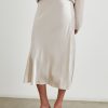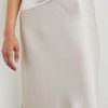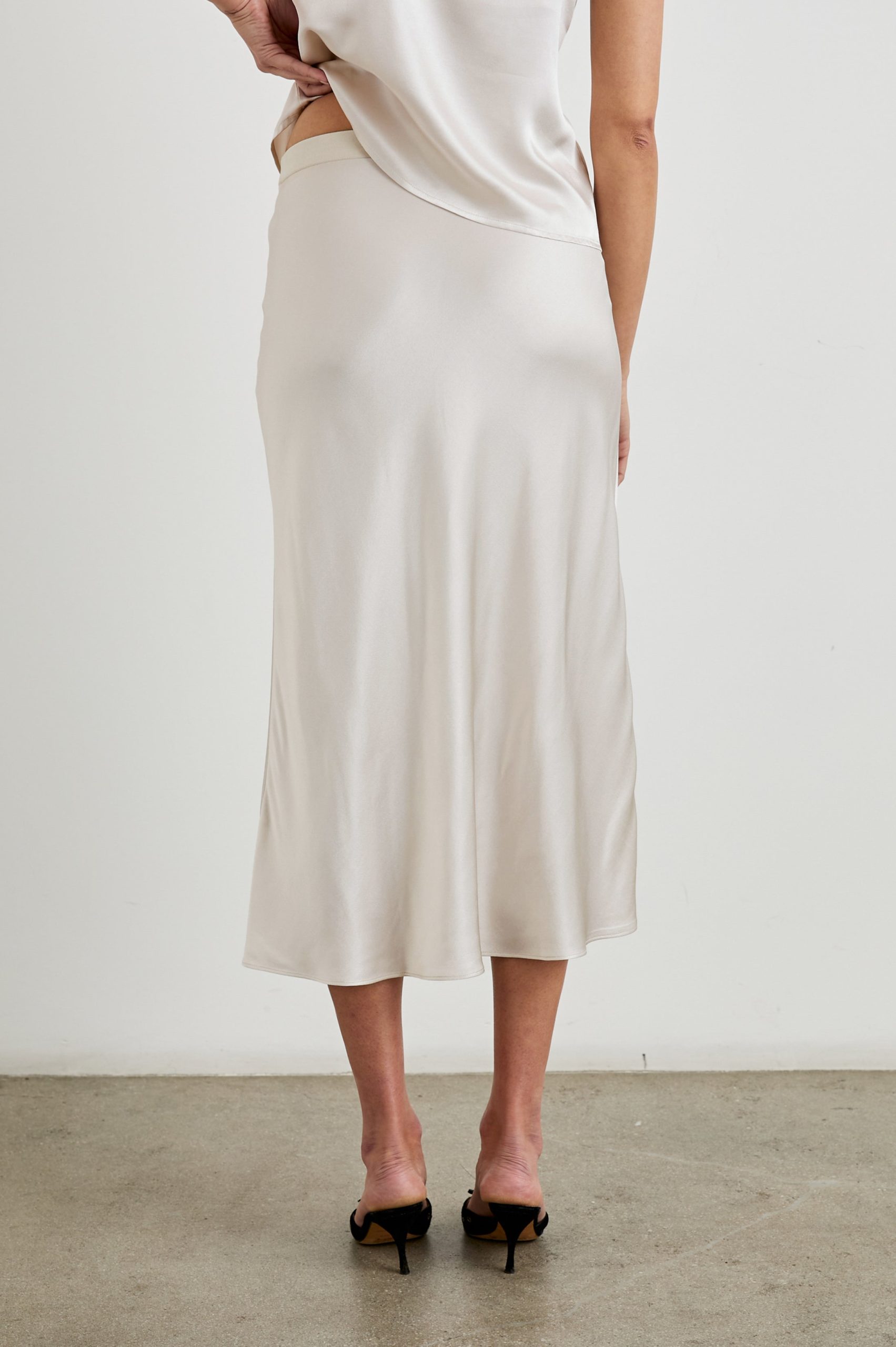 Luxe satin crepe, high-rise, unlined, sleek ivory midi skirt featuring exposed elastic waist and flattering bias cut.