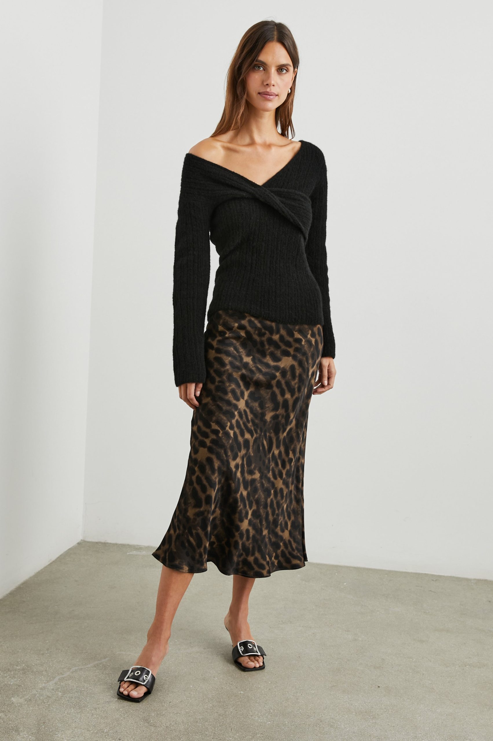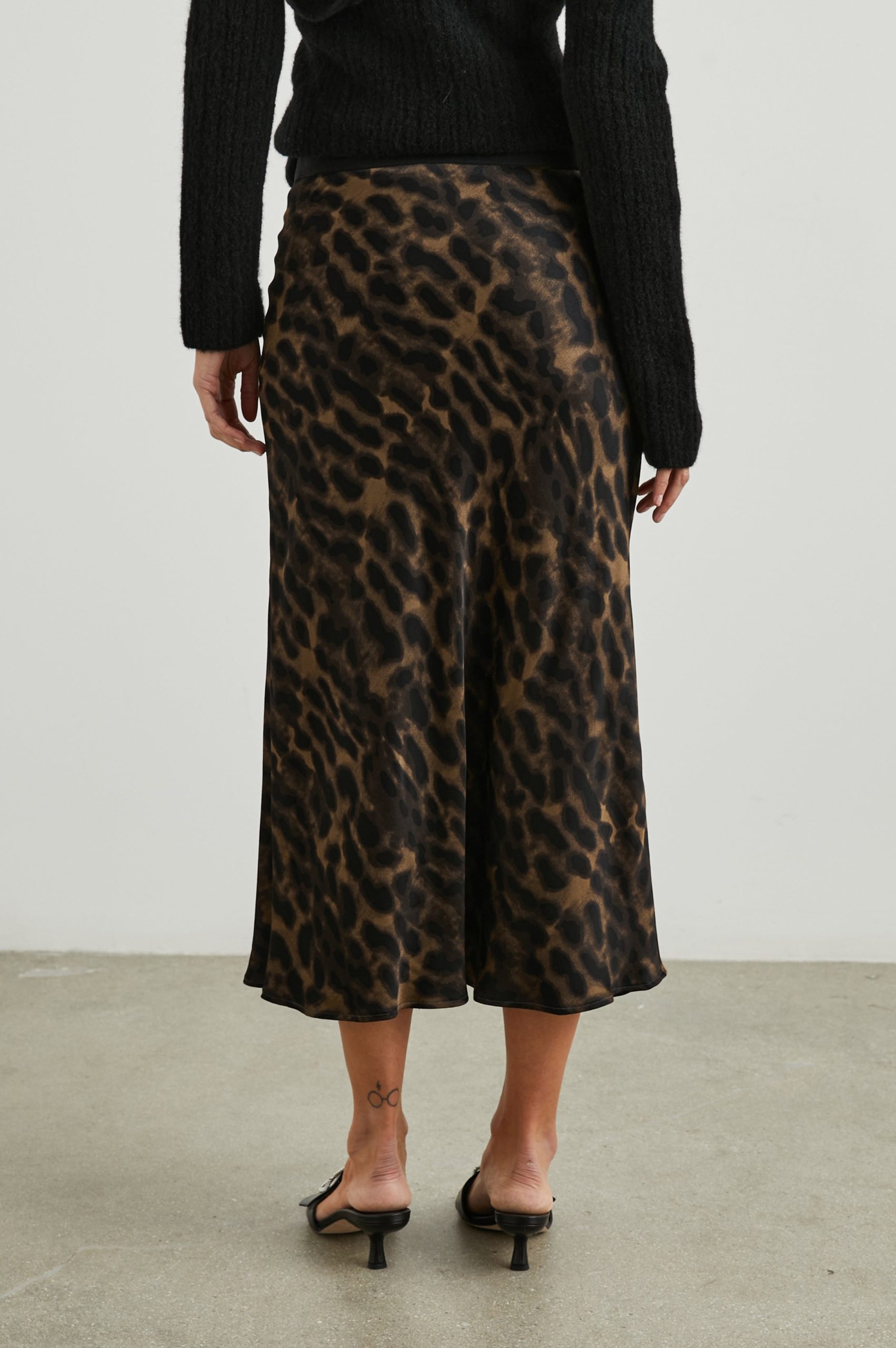 Super smooth, satin crepe, high-rise, unlined, sleek leopard print midi skirt featuring black exposed elastic waistband, swingy fit, and flattering bias cut. Made with luxurious fabric in an easy pullover silhouette, this swingy skirt is perfect for work or play.