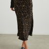 Super smooth, satin crepe, high-rise, unlined, sleek leopard print midi skirt featuring black exposed elastic waistband, swingy fit, and flattering bias cut. Made with luxurious fabric in an easy pullover silhouette, this swingy skirt is perfect for work or play.