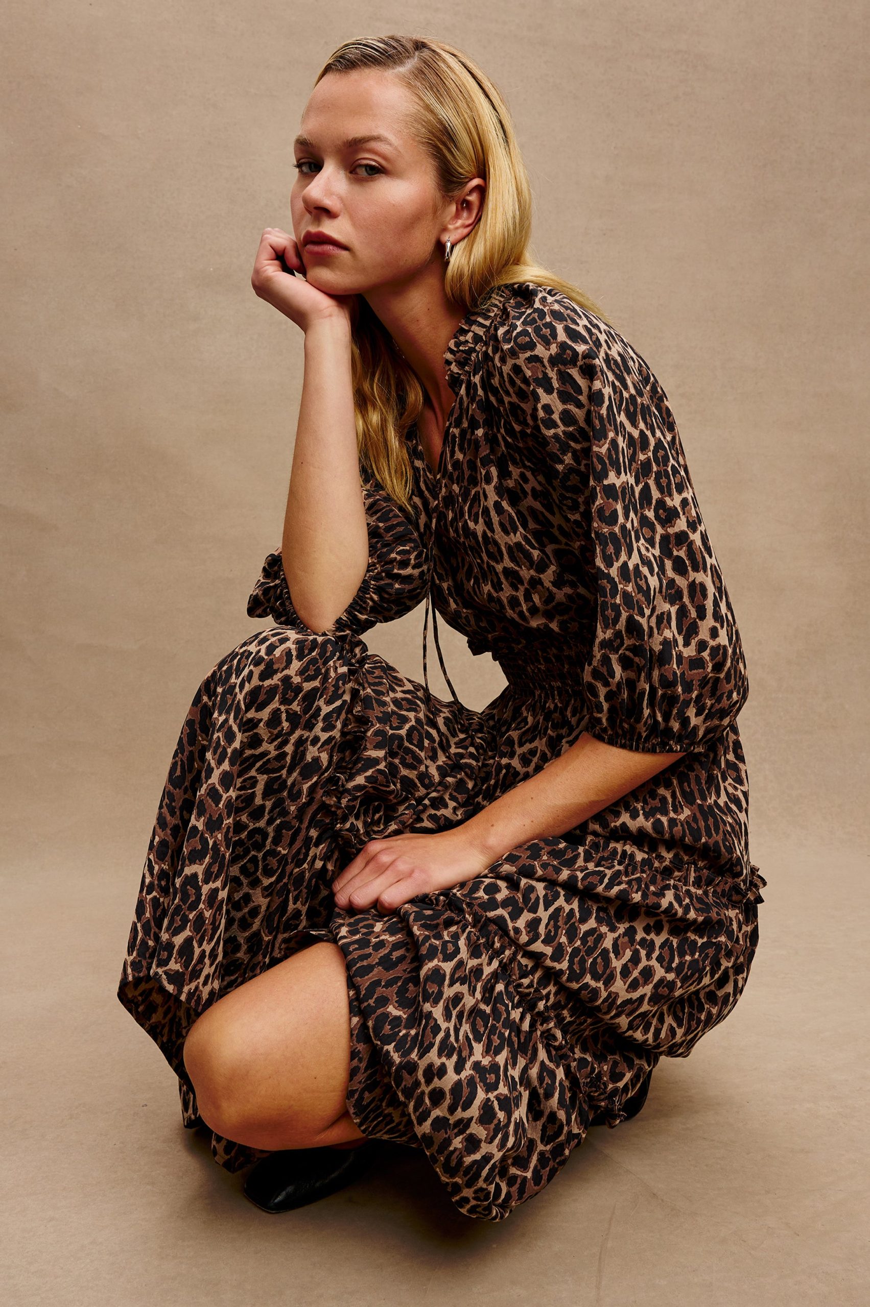 The Caterine is tiered maxi crafted from structured, breathable cotton poplin. With a cinched silhouette, neck ties and ruffled details, this dress is feminine and functional.