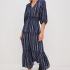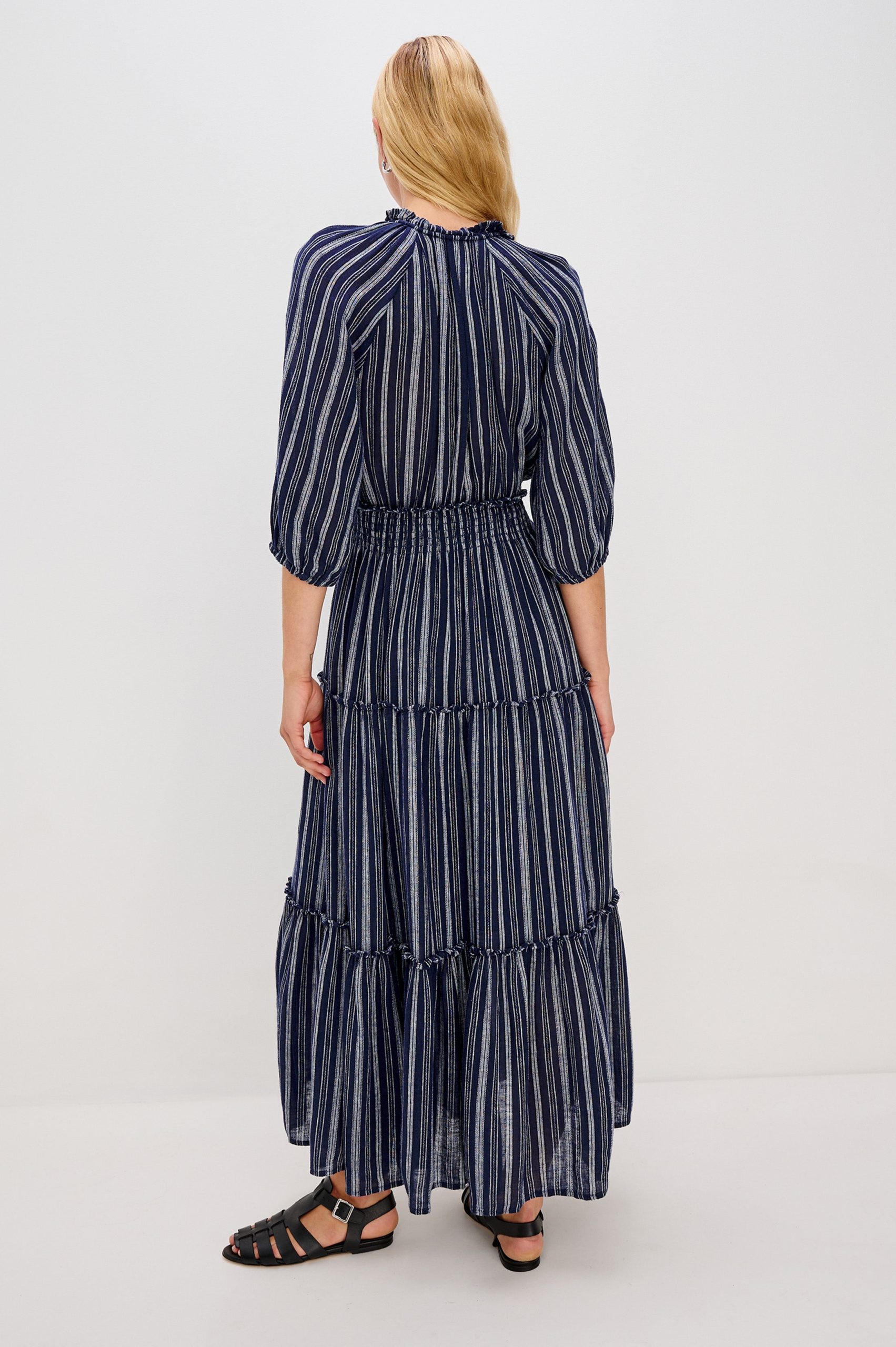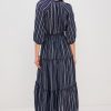 The Caterine is tiered maxi crafted from structured, breathable cotton poplin. With a cinched silhouette, neck ties and ruffled details, this dress is feminine and functional.