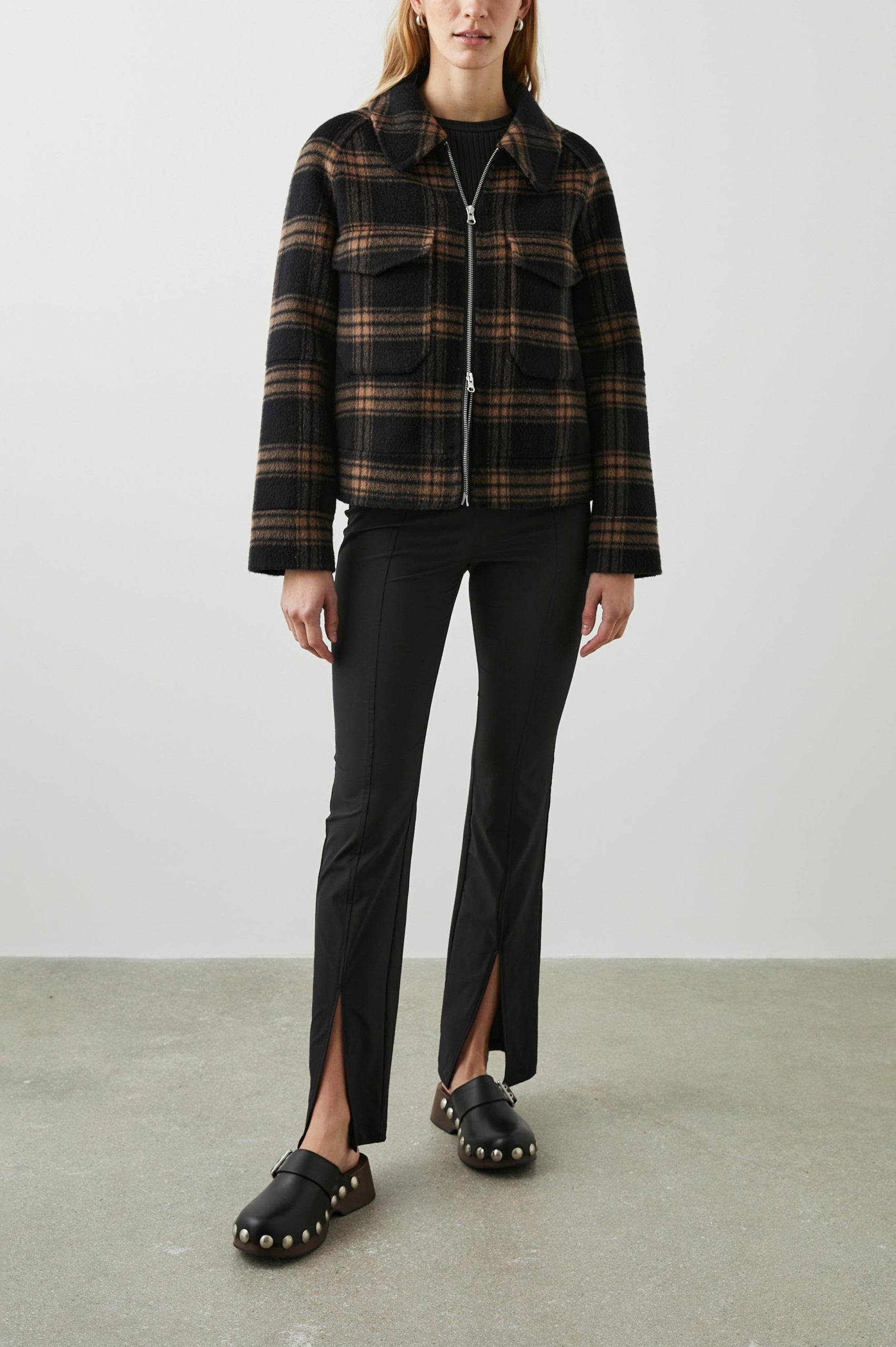 This easy to layer, throw-on-and-go piece will effortlessly take you from day to night in style. Made from a heavyweight wool blend, this unlined zip up jacket features an oversized collar, oversized flap pockets at chest, and a raglan sleeve.