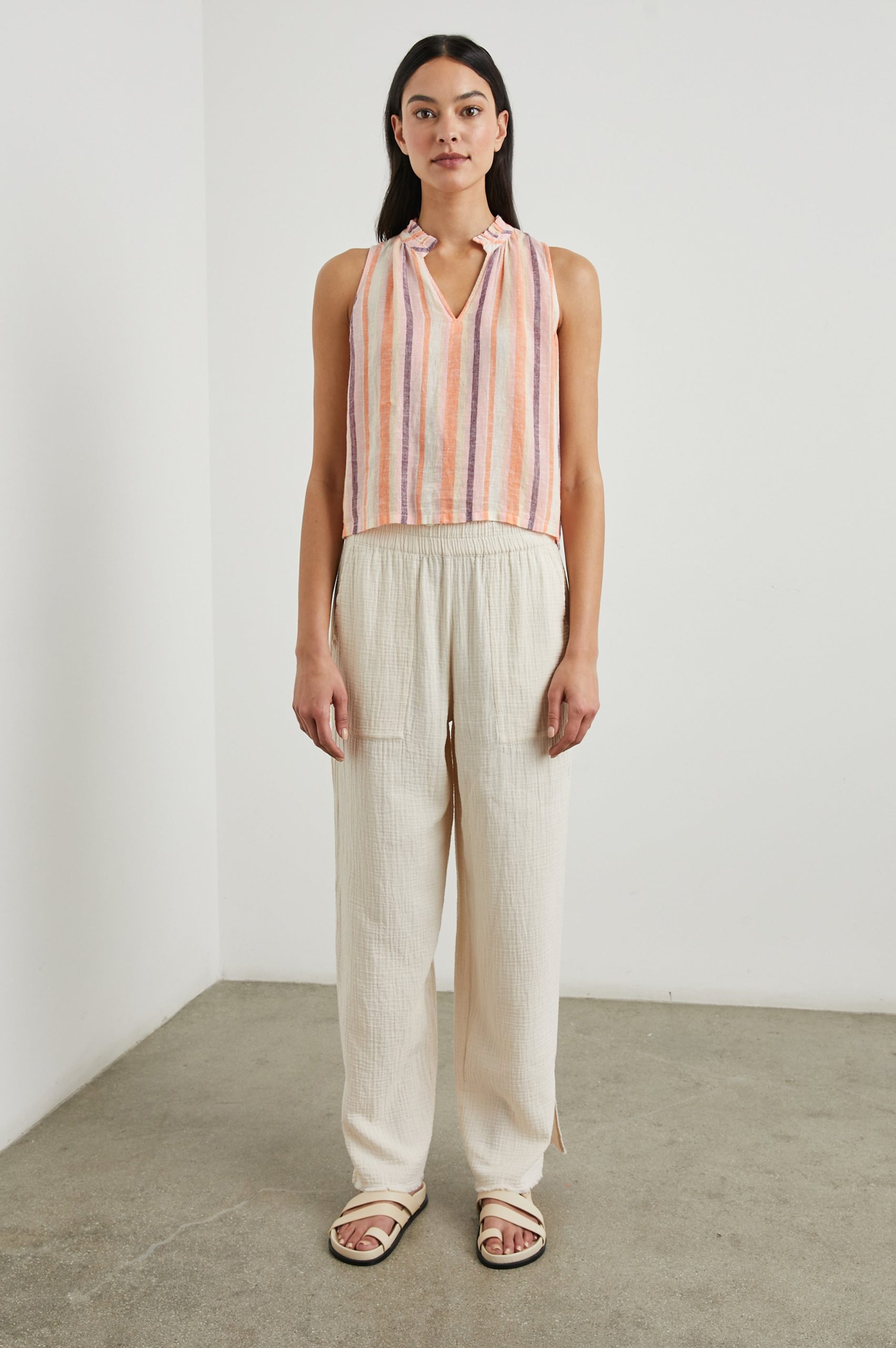 Crafted from airy luxe linen in Papaya Stripe, the Christy will be your go-to for the season for all your weekend activities.
