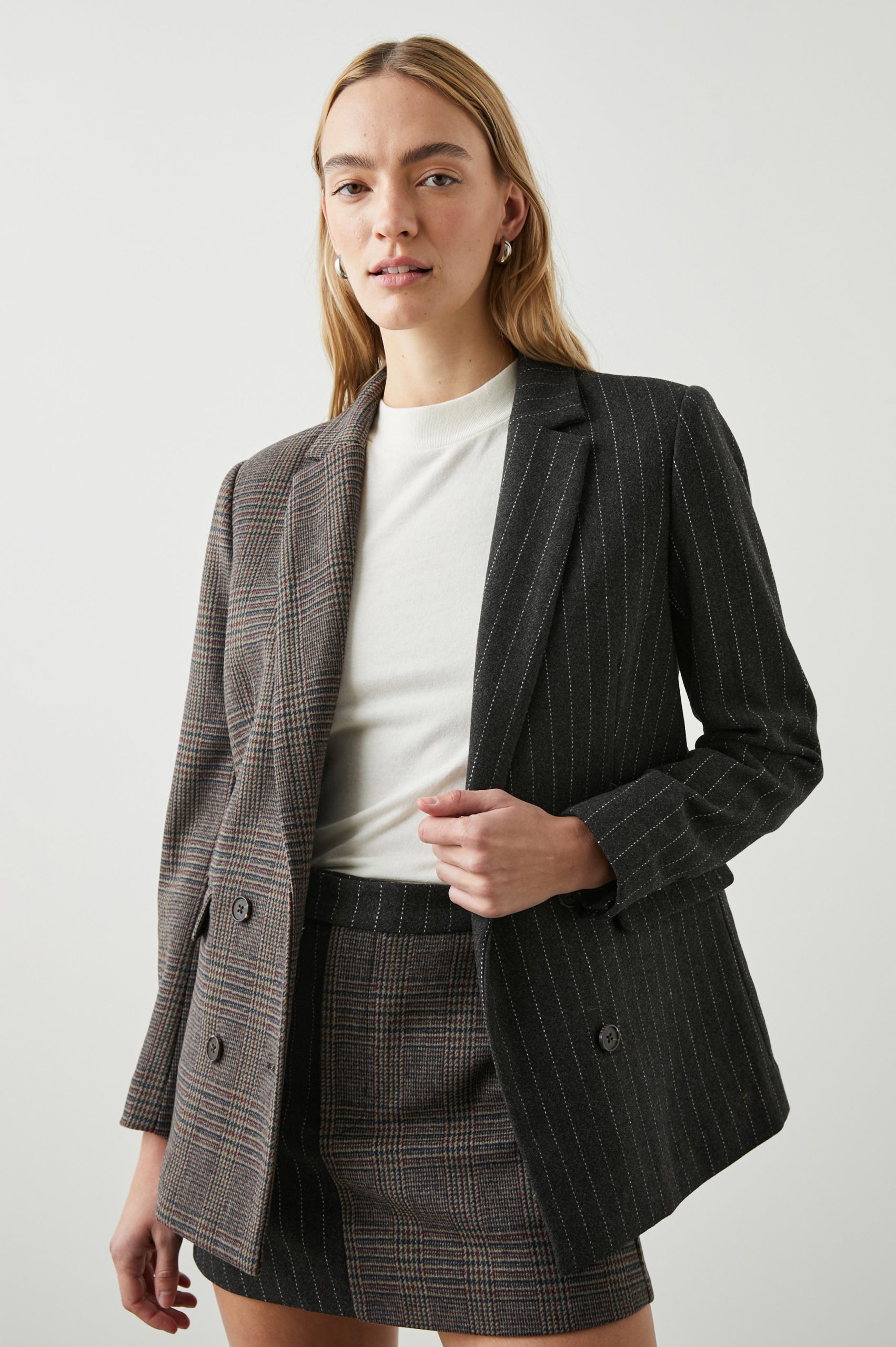 Tailored to perfection, this menswear inspired blazer will take your style to the next level. Made from a wool blend, this double-breasted mixed print blazer jacket features faux horn buttons, notched lapels and functional flap pockets.