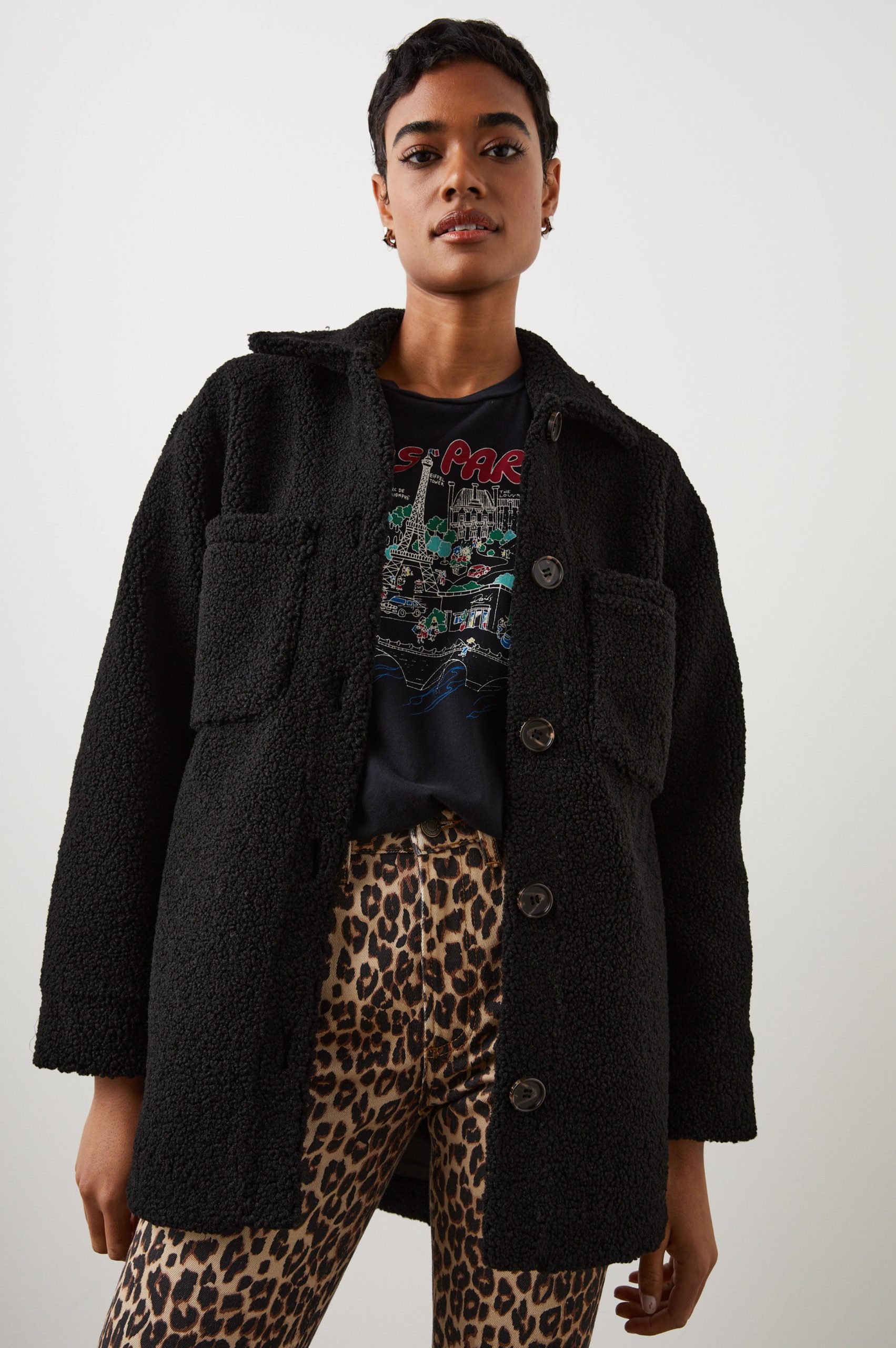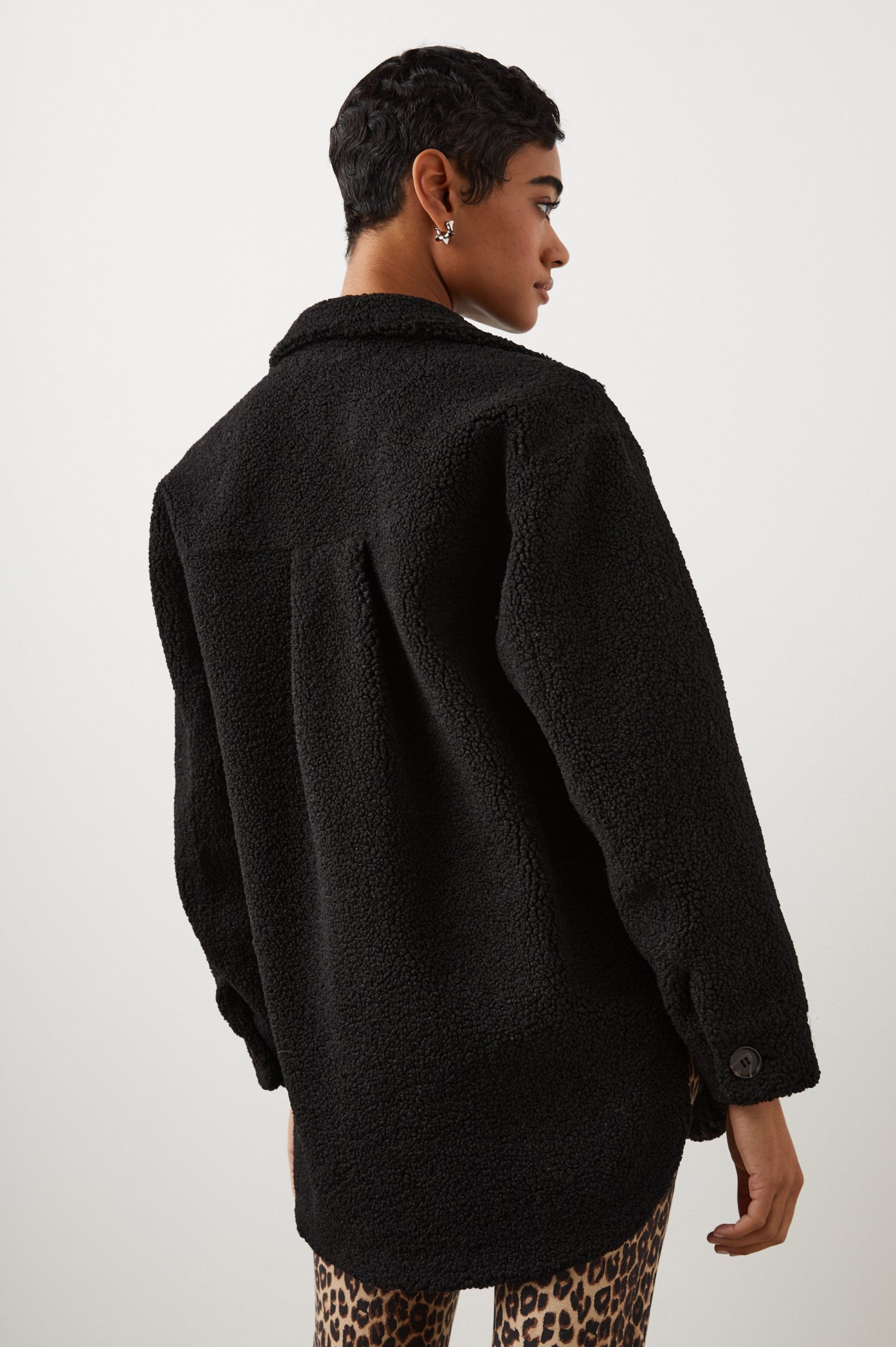This super cozy shirt jacket is the perfect third piece sure to elevate any outfit. Made from sherpa fleece, this unlined coat features a slightly oversized fit, dropped shoulder, two patch pockets, faux horn buttons, and side slits at hem.