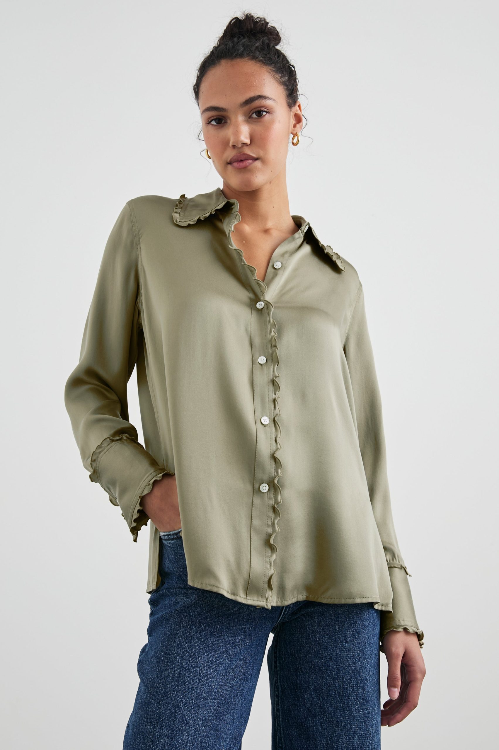 Embody feminine charm in the Fia, the silk charmeuse top that deserves a prime position in your closet. Delicately crafted with bias-cut lettuce edges adorning the collar, a button placket, and sleeve cuffs, every detail speaks to its quality craftsmanship and timeless appeal. Style with jeans for a pared-down look, or elevate with a skirt or tailored trousers — the Fia is destined to become a cherished wardrobe favorite.
