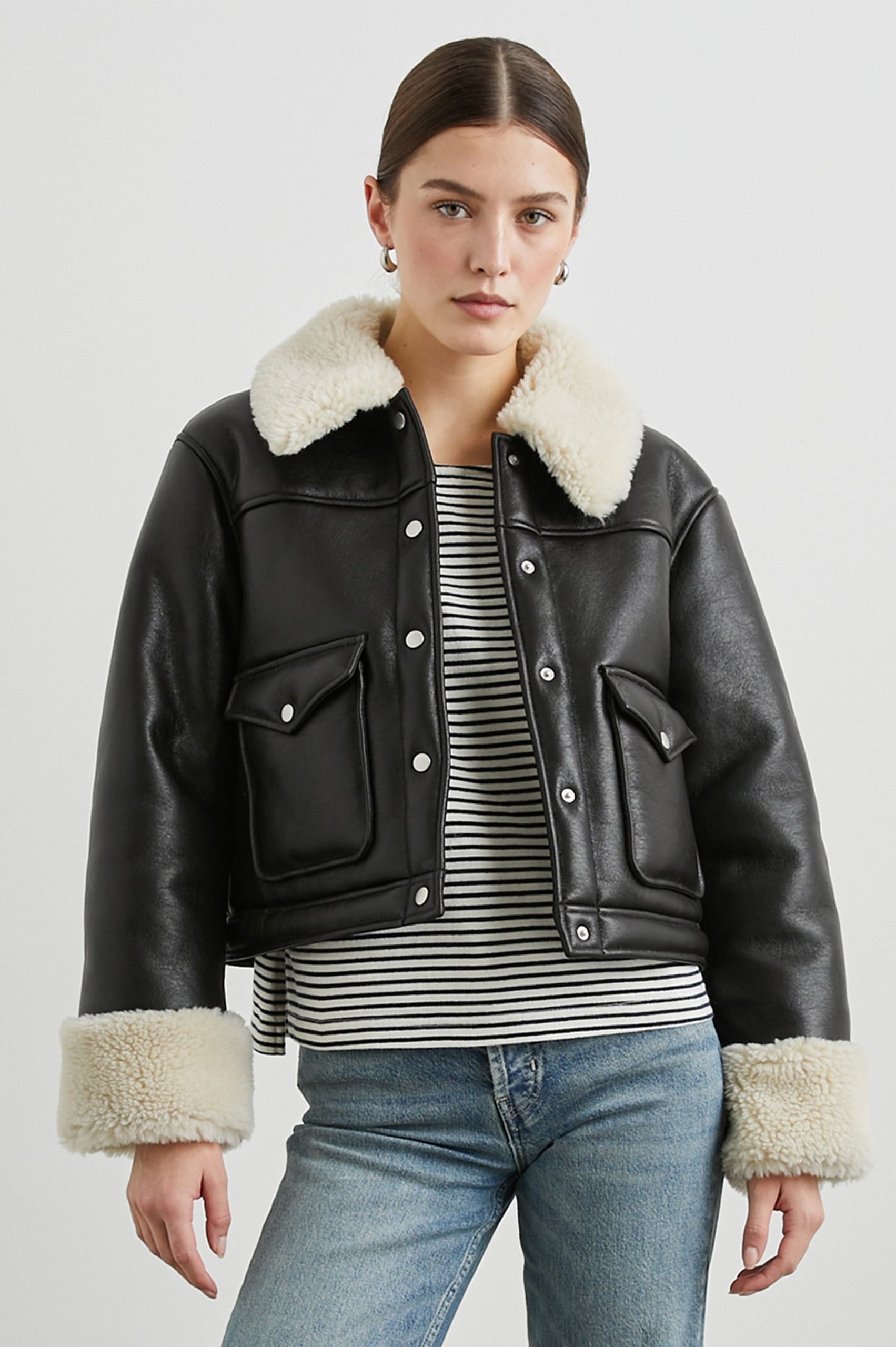 The cropped jacket that keeps you warm and looking cool. The Imani is constructed from faux leather with a shearling lining, cuffs and collar for optimum coziness during cooler temperatures. With statement (and functional) patch pockets, silver buttons and a boxy fit, this jacket is a must have.