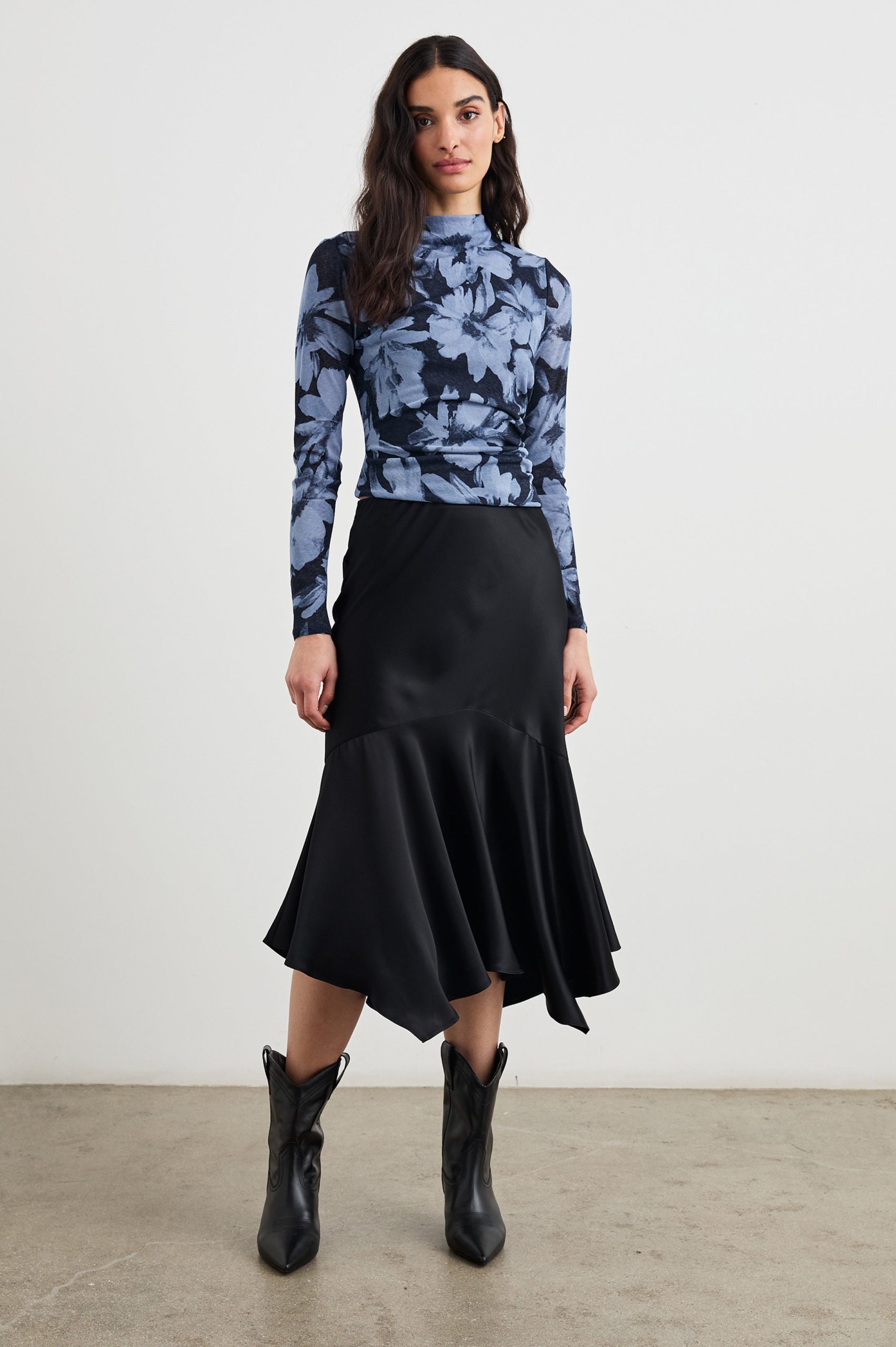 A modern take on the classic long sleeve, the Joelle top is crafted from a soft gauge jersey with an asymmetrical mock neck with shirring details from the right shoulder. Pair with a skirt or your favorite jeans to elevate any outfit.