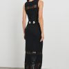 The Kiana is a body-skimming midi dress with delicate shell accents at the waist and neckline. Finishing details include sheer paneling and ankle-sweeping fringe.