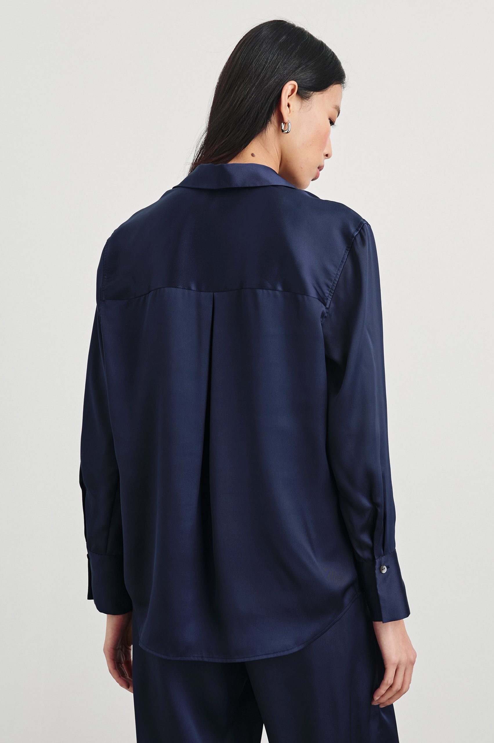 Crafted in shiny twill, this soft and sleek button-down features a relaxed body for everyday wear. Tuck in, layer over a tank, or pair with the Damani Pant for an instant outfit.