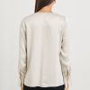 Refine your day-to-day rotation with Liliana, a luxe, satin shirt with a boxy shape. Finished with thoughtful details like a center front seam exposed with a unique stitch, airy side slits, and wider cuffs, makes a subtle statement in any context.