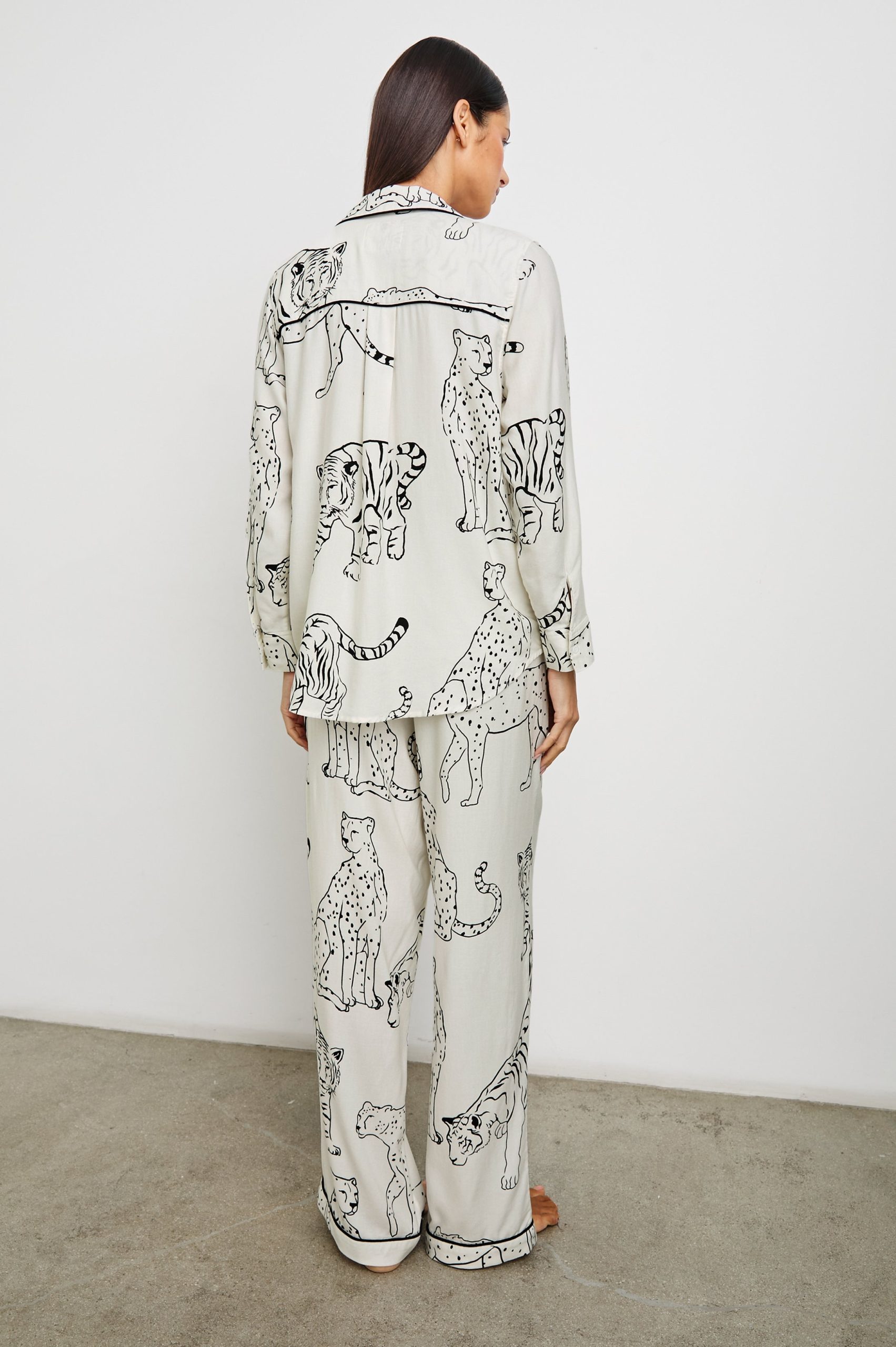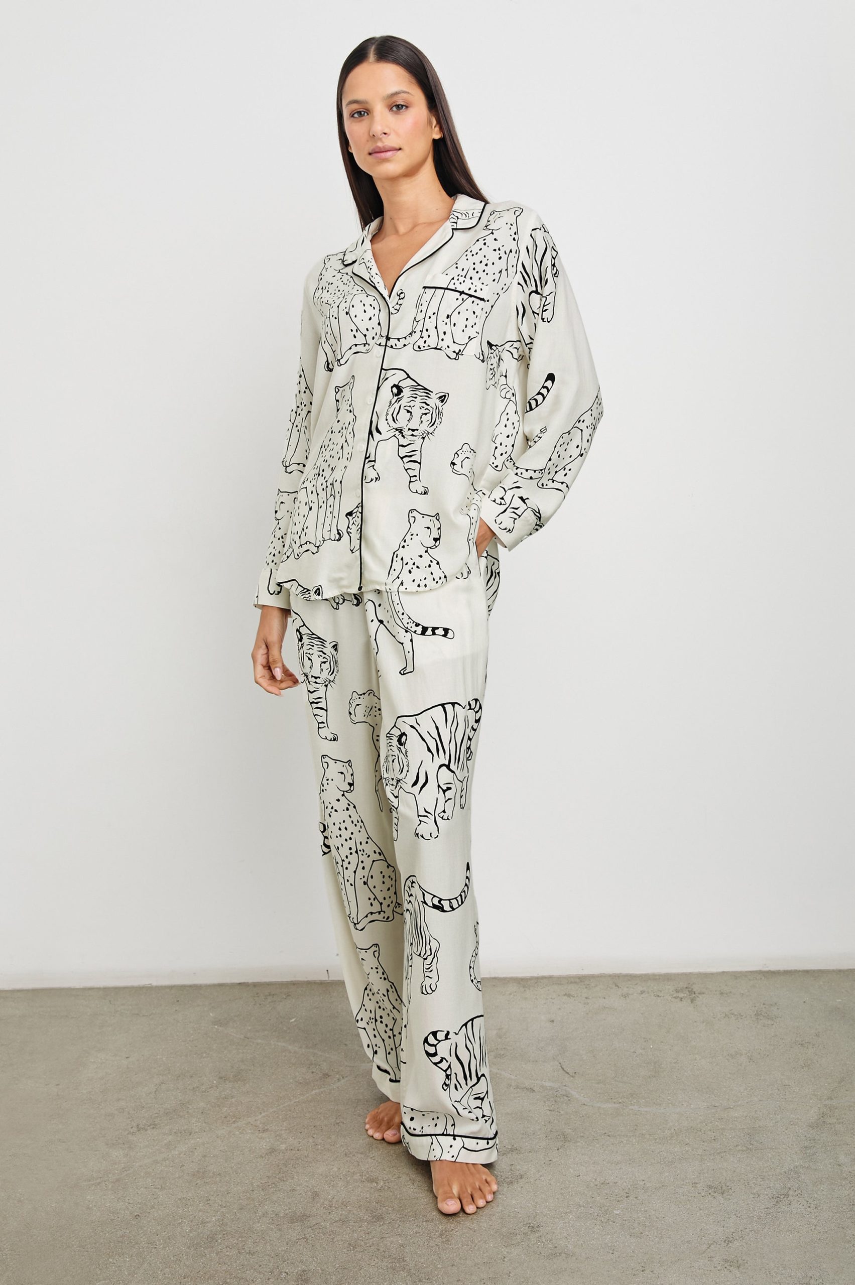 It’s nothing but sweet dreams in the Luna Pajama Set. Crafted from ultra-luxe brushed cotton, the Luna boasts a uniquely soft hand-feel for superior comfort and convenient pant pockets. Complete with a cat-tastic print, sleep time will feel like a safari, night after night.