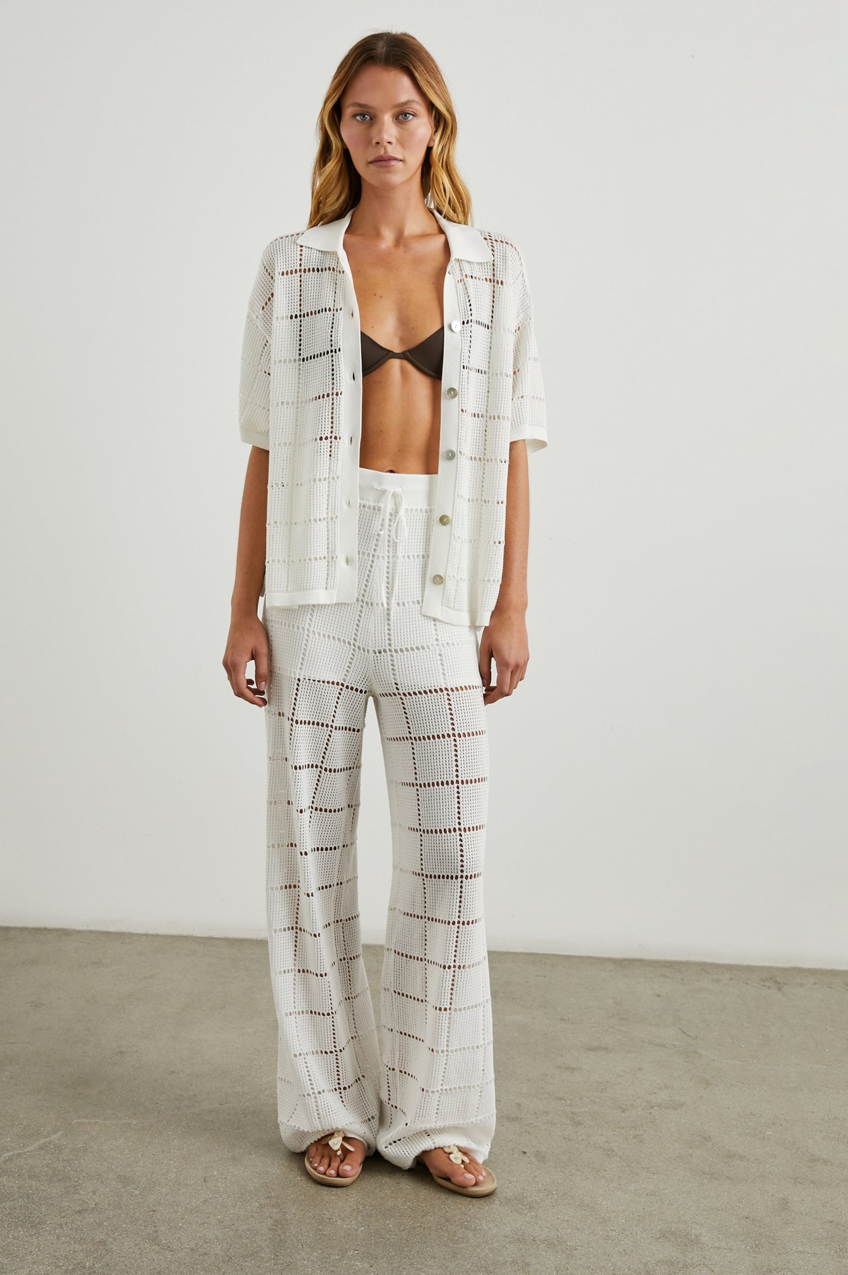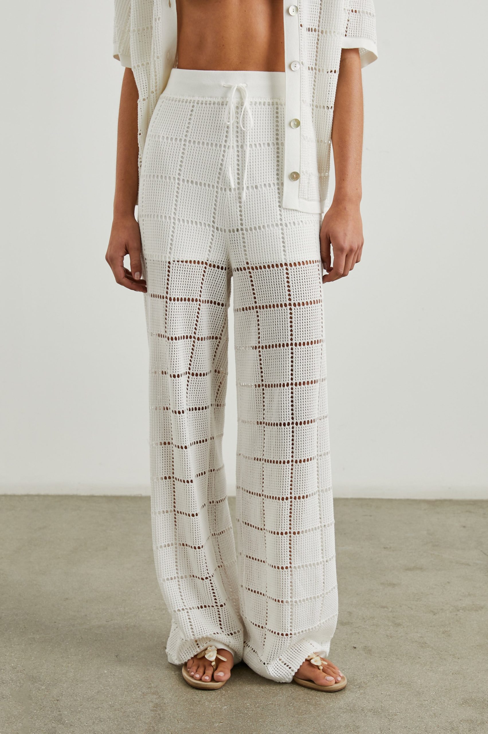 The Maja is a classic wide-legged, high-waisted pant with a shirred drawstring waist. This pant features an open-stitch grid design and a short lining for your comfort. Make it a match with the Clemente top for the ultimate casual set.