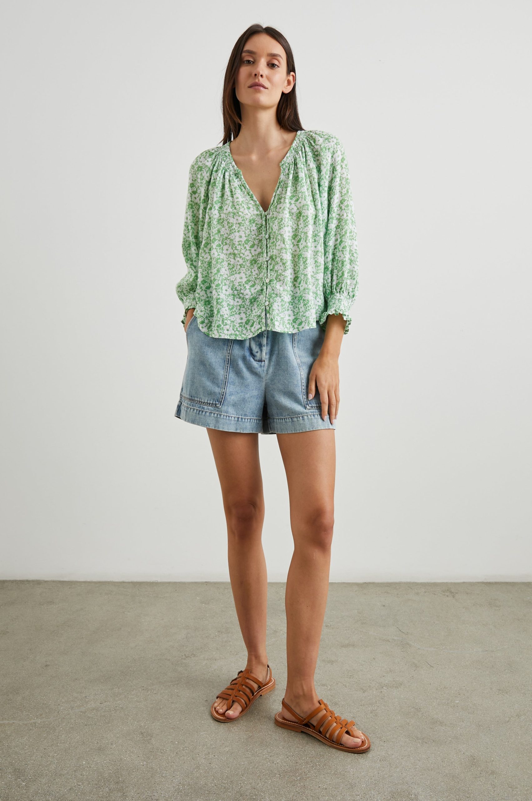 This pretty pullover top features natural shell buttons, elastic smocked detailing at cuffs, and a relaxed fit.