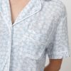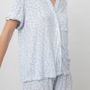 Super cozy, lightweight jersey, sky blue pajama set with short sleeve buttondown shirt and elastic waist drawstring shorts featuring white stars print, pajama style notched collar, patch pocket at chest, white piping trim, and relaxed fit. Made from smooth, ultra soft rayon blend fabric with a stretchy jersey knit, this stylish two-piece set is ideal for those warmer nights.