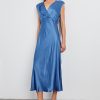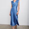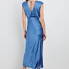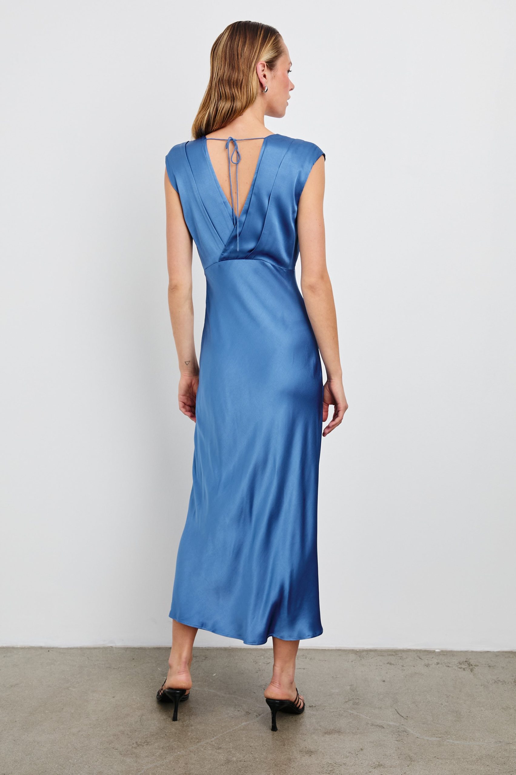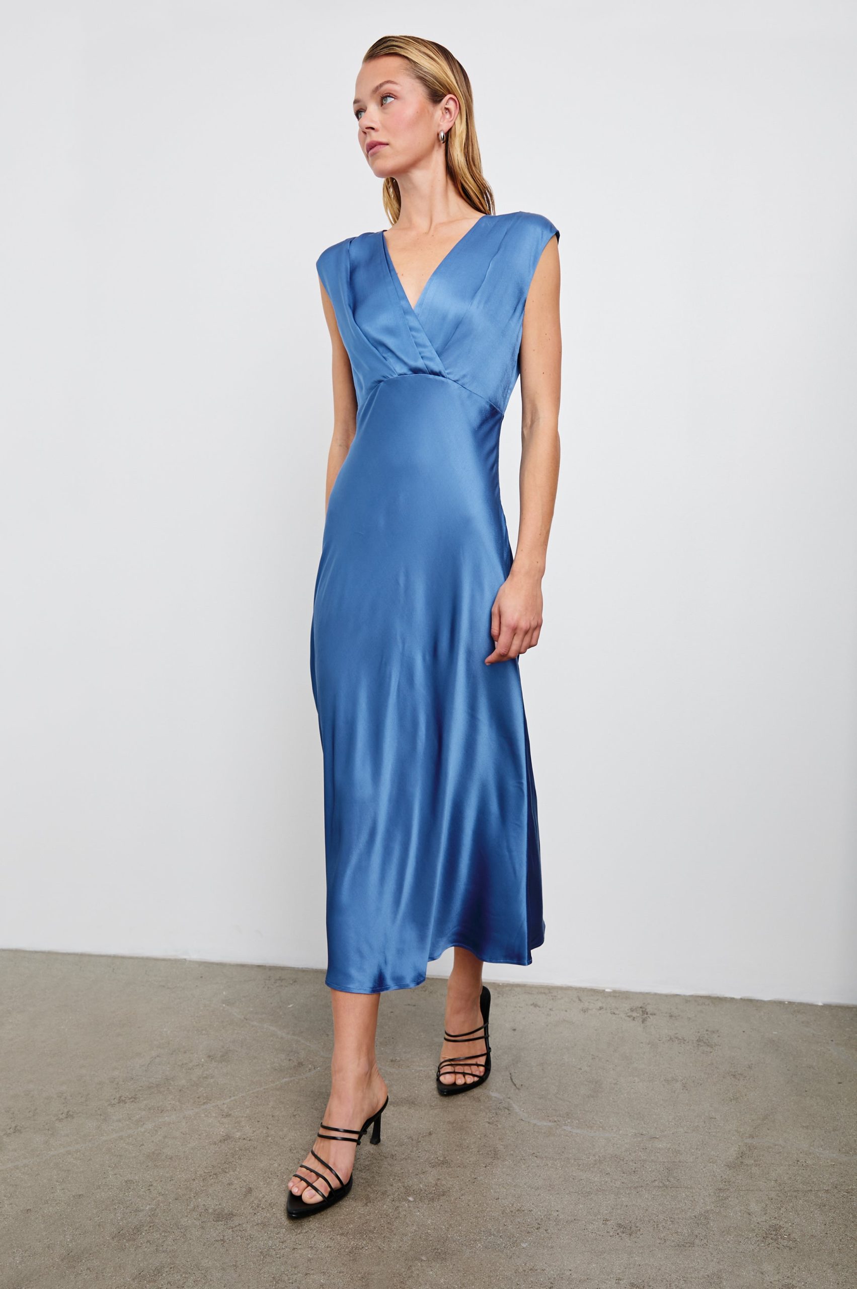 The Odella is a mid-length, event-ready dress crafted from a luxe satin crepe. It features a bias-cut skirt and double-front crossover bodice, while a back tie keeps it secure.