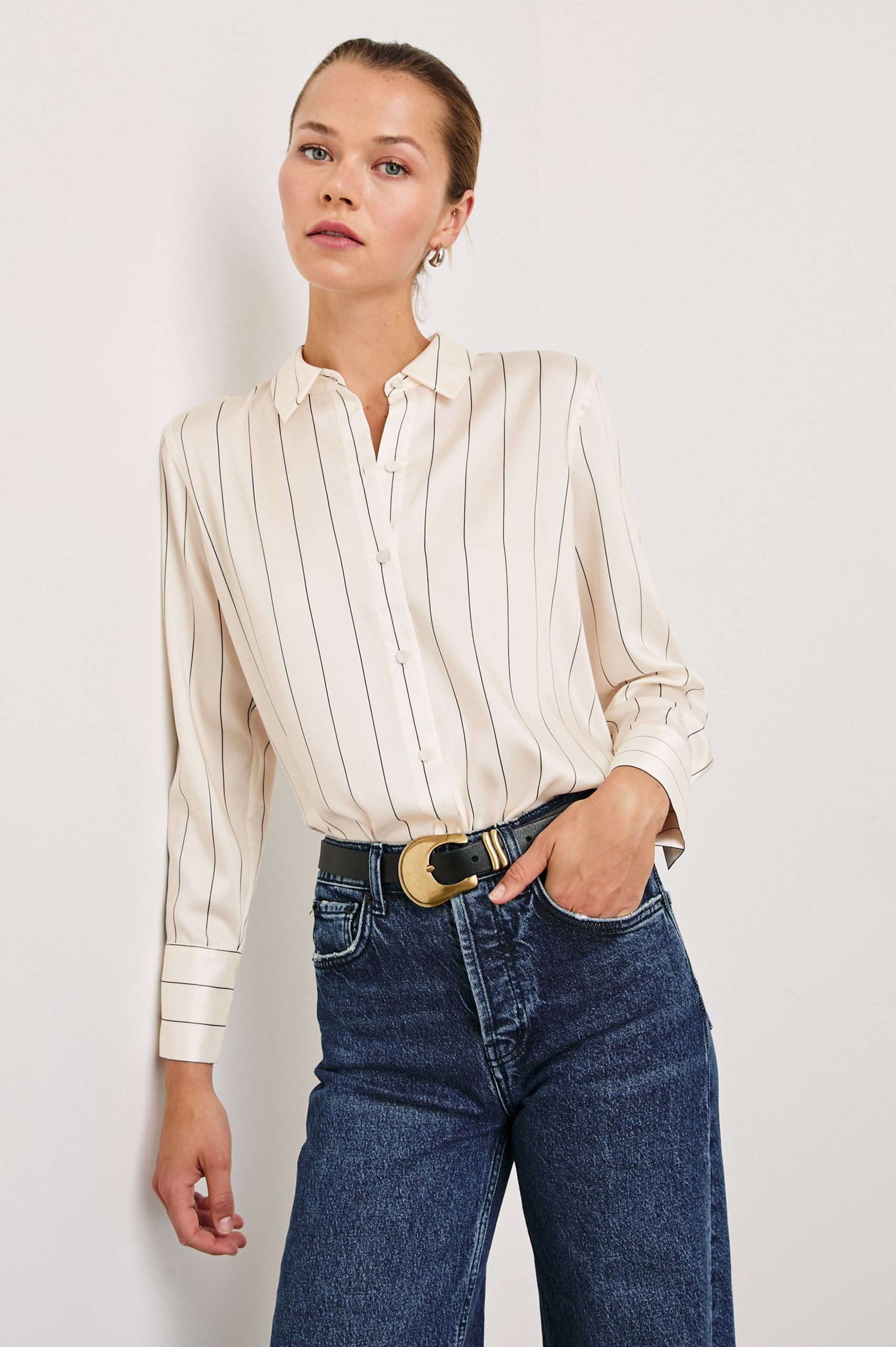 The striped button-down you’ve been searching for. Go from work to the weekend with the ultimate lightweight layer, cut from a supple, shiny twill fabric. With contrasting collars and cuffs reminiscent of heritage styles, this is the button-down you’ll wear this season.