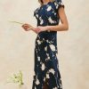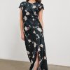 An occasion-ready take on the t-shirt dress. The midi length Serenity has a crew neckline with wide, short sleeves, and asymmetrical draping to create an hourglass silhouette.