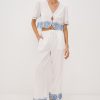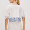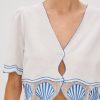 Made with heavy luxe linen, the Venice cropped button-front top features an airy, relaxed fit and a scalloped hem with delicate seashell embroidery.