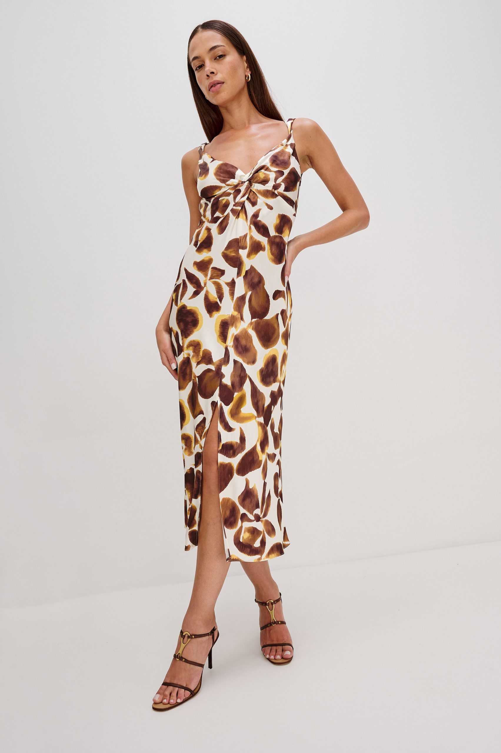 Cut on the bias from supple satin back crepe for a flowing silhouette, the Viviana features a V-neckline with a center-front twist and a skirt slit—adding extra dimension beyond a simple slip dress.