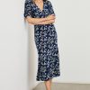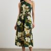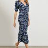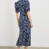 The Zariah is a heritage-inspired midi crafted from luxurious rayon crepe fabric. This style has an empire waistline, plunging V-neckline and elbow-length short sleeves, subtly puffed with light ruching.